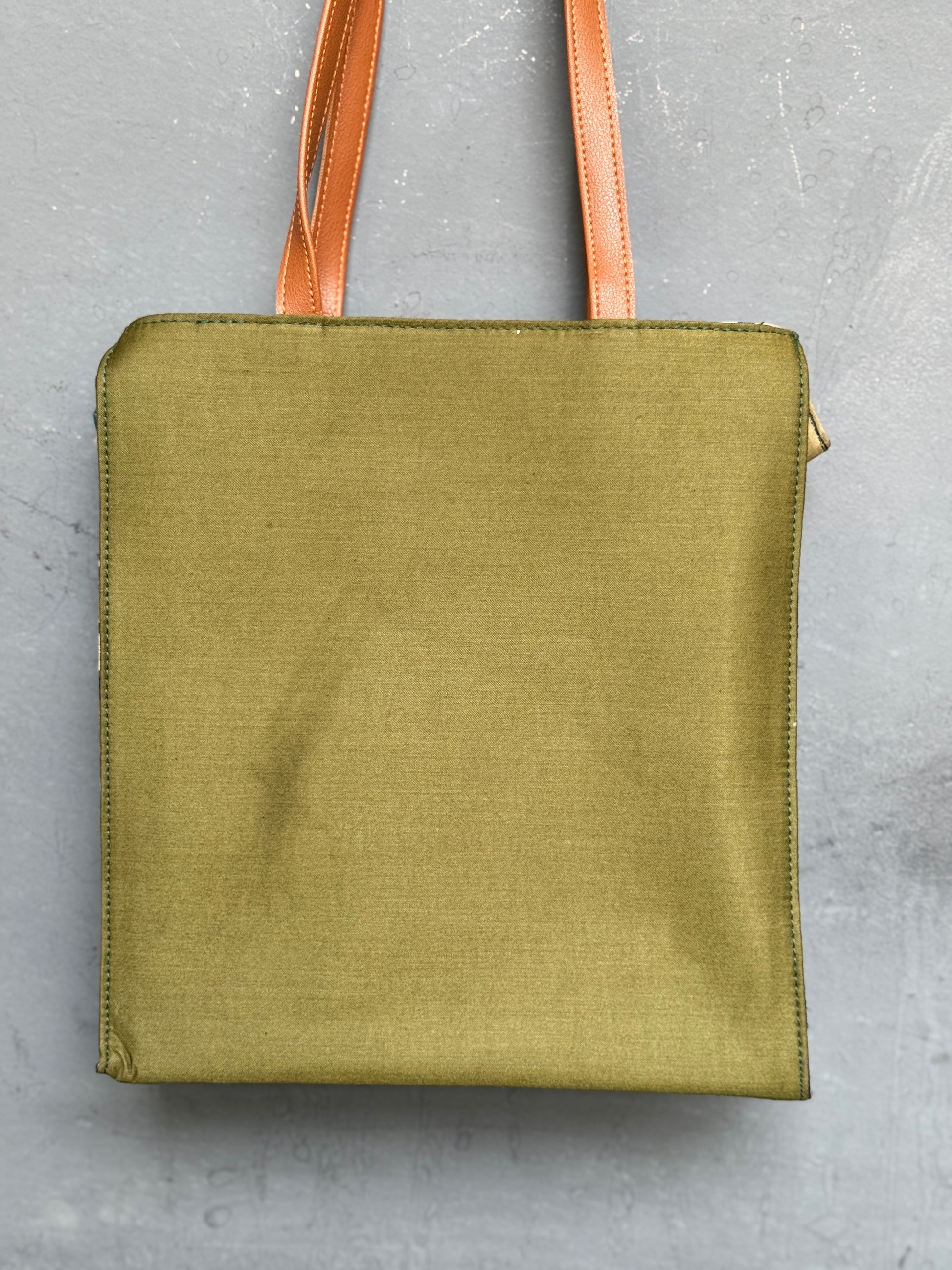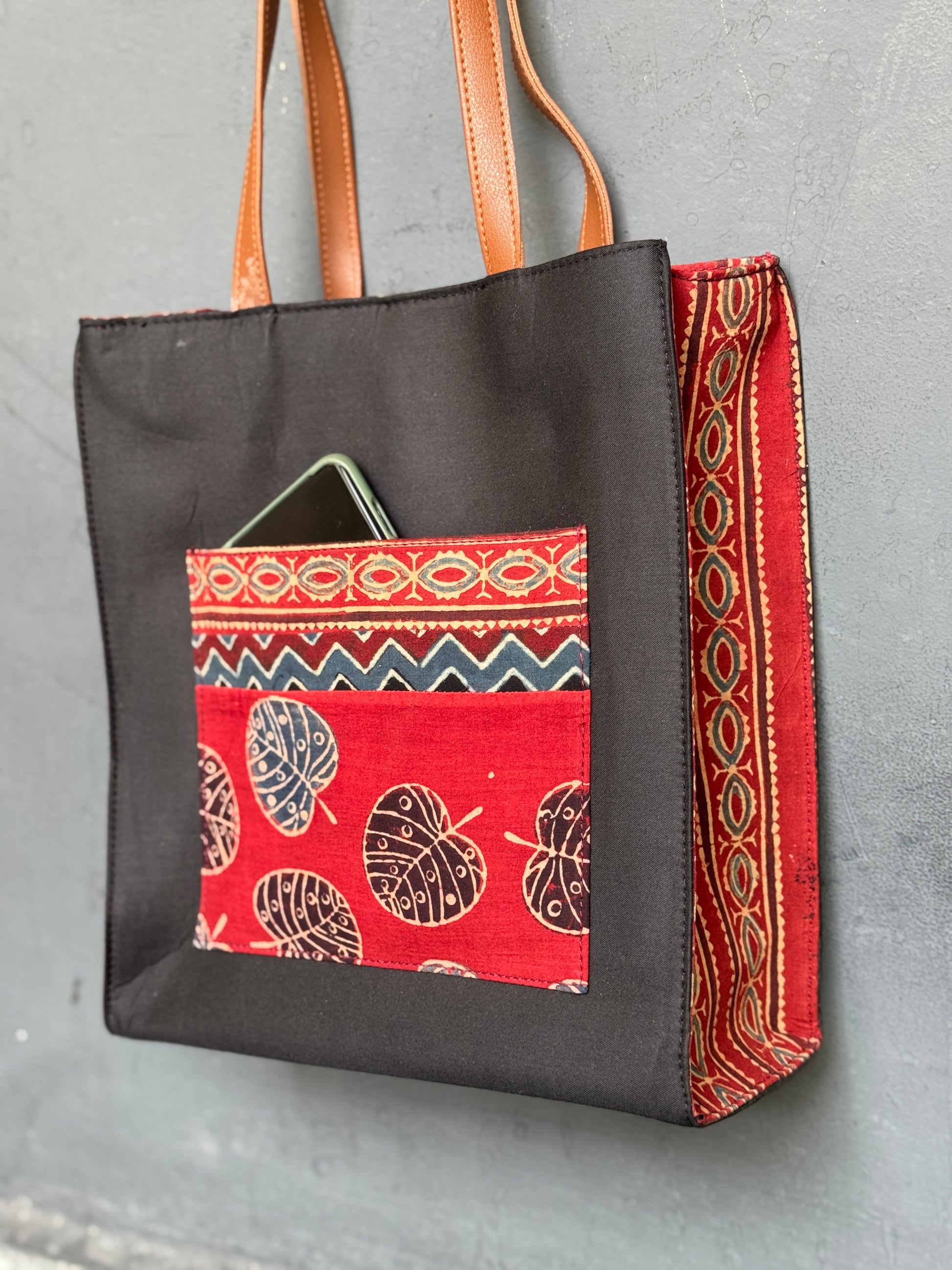 Wide base hand block printed, fabric tote bag with front patch pocket