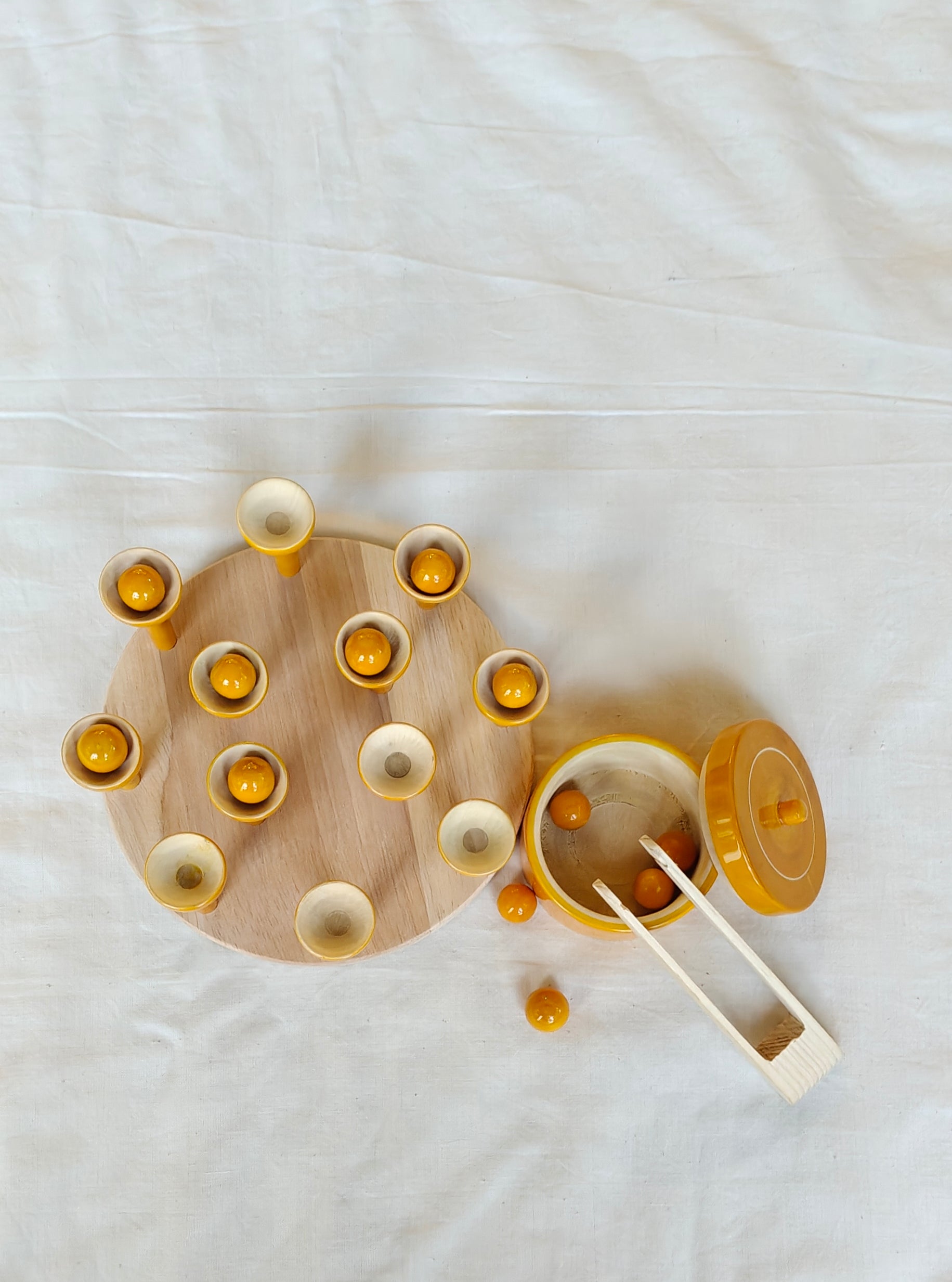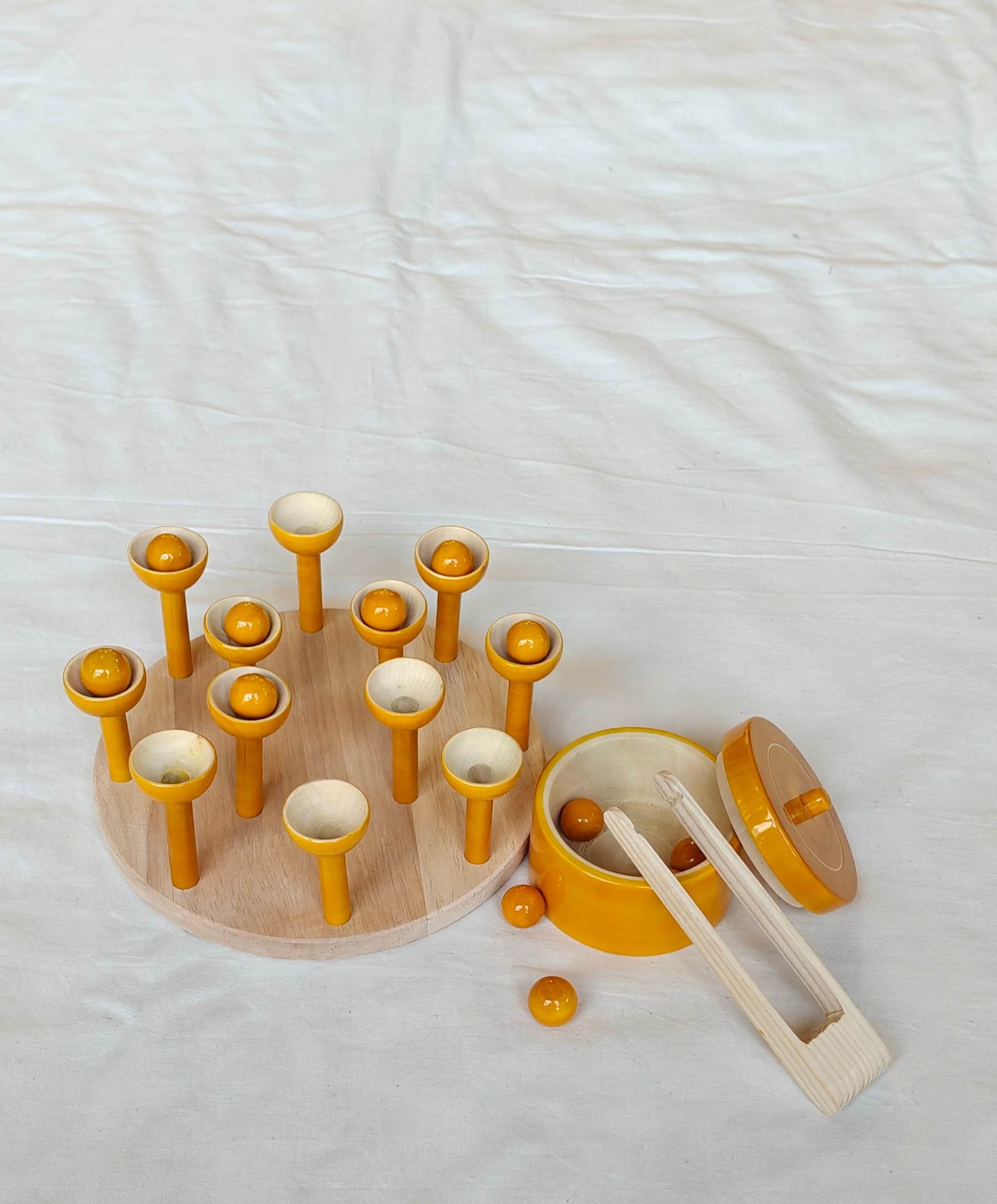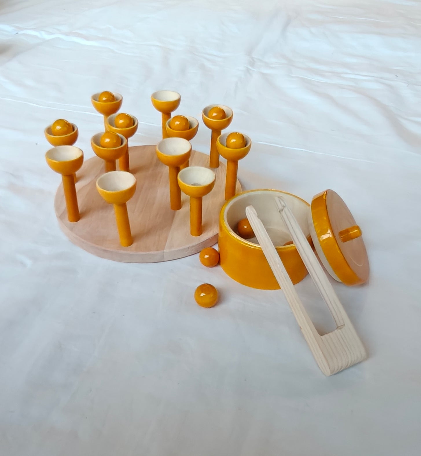 Wooden ball picking game with 12 balls, base, 12 cups, tong and a container