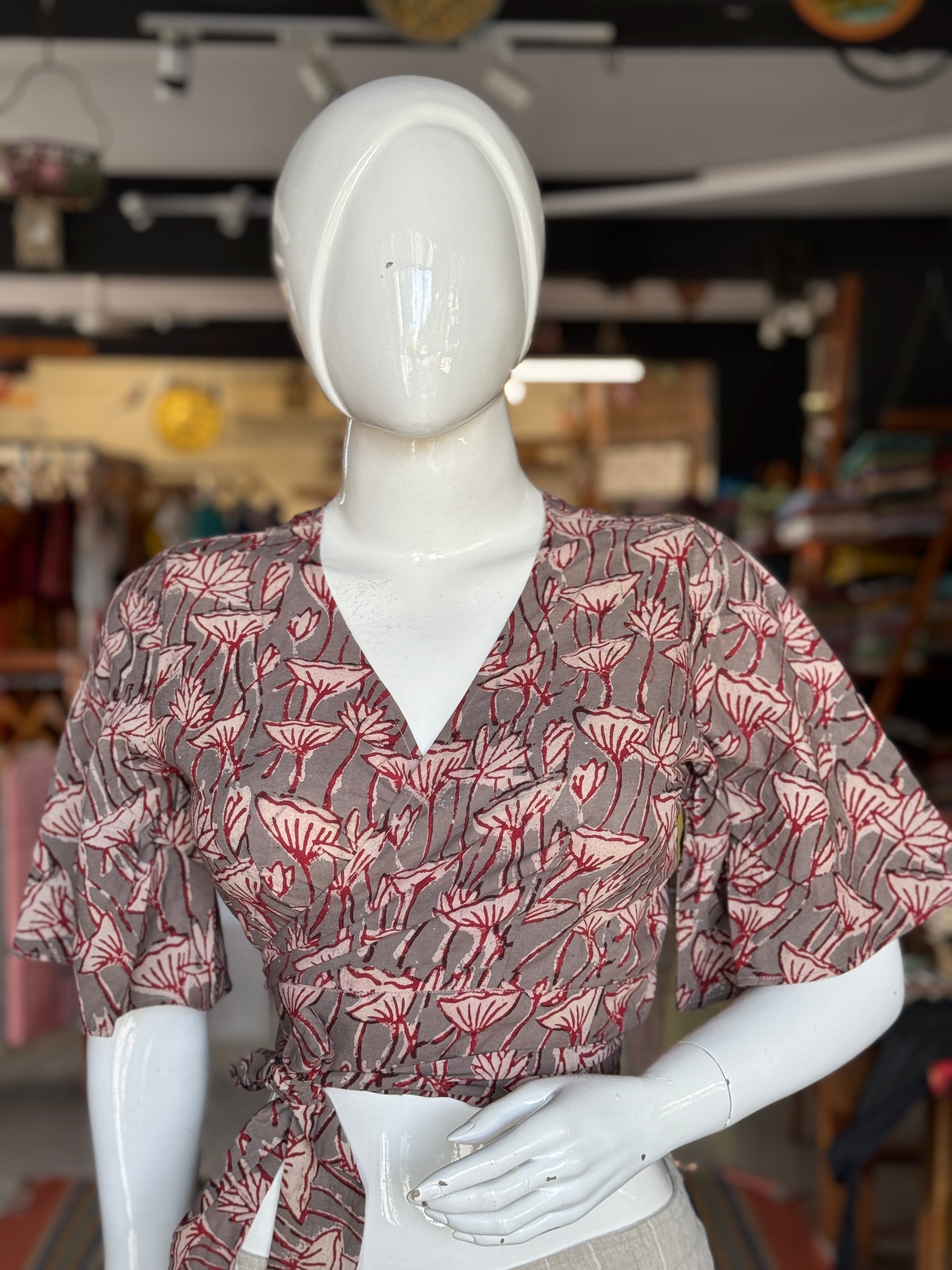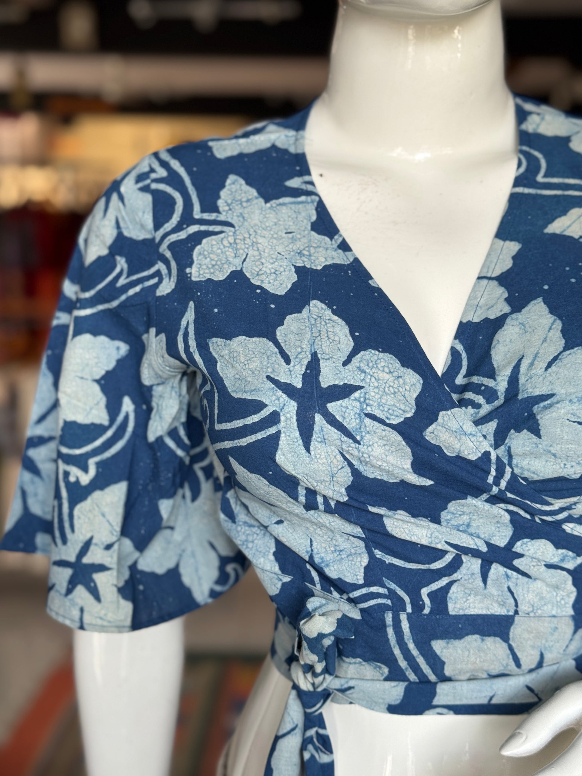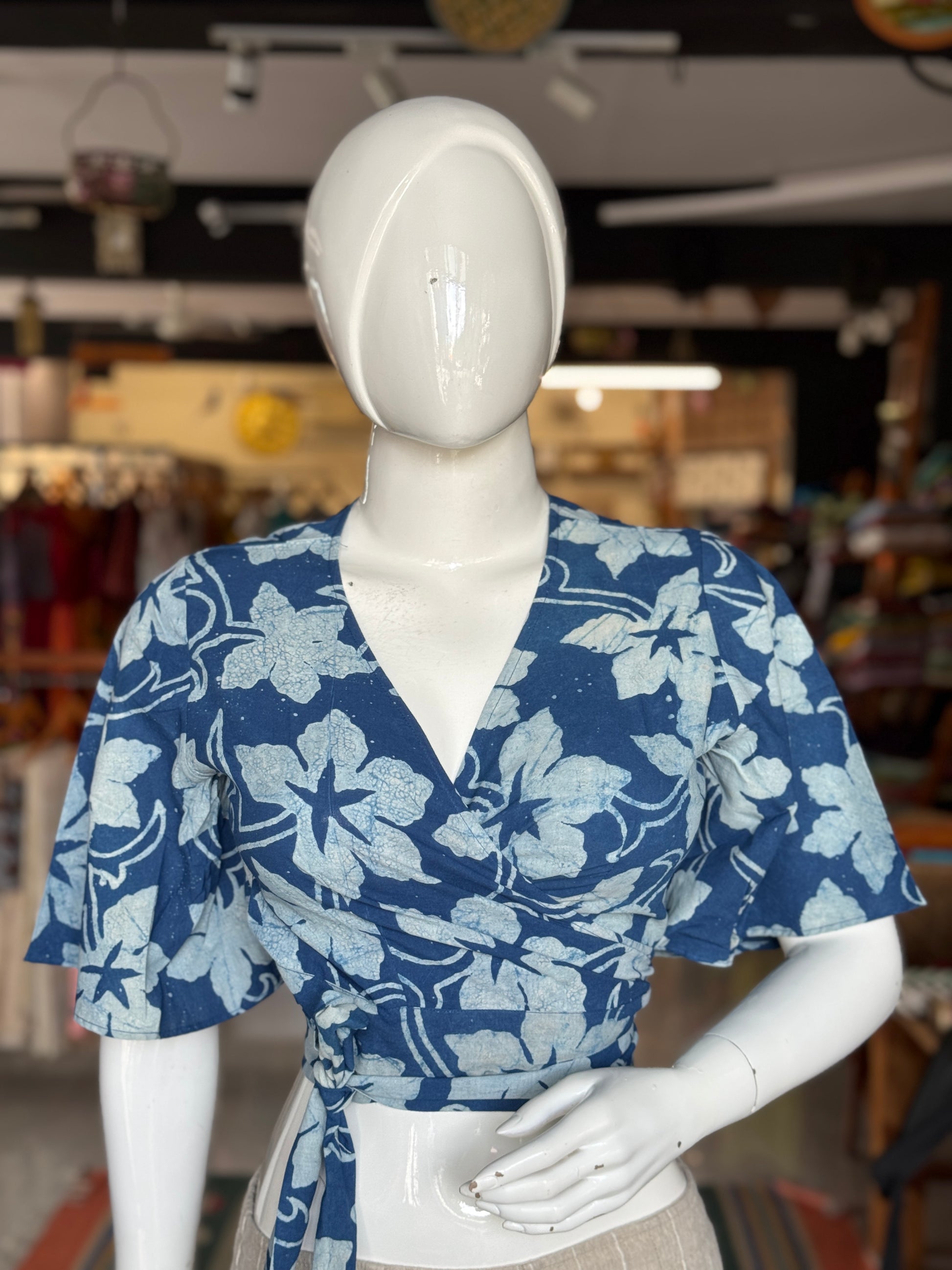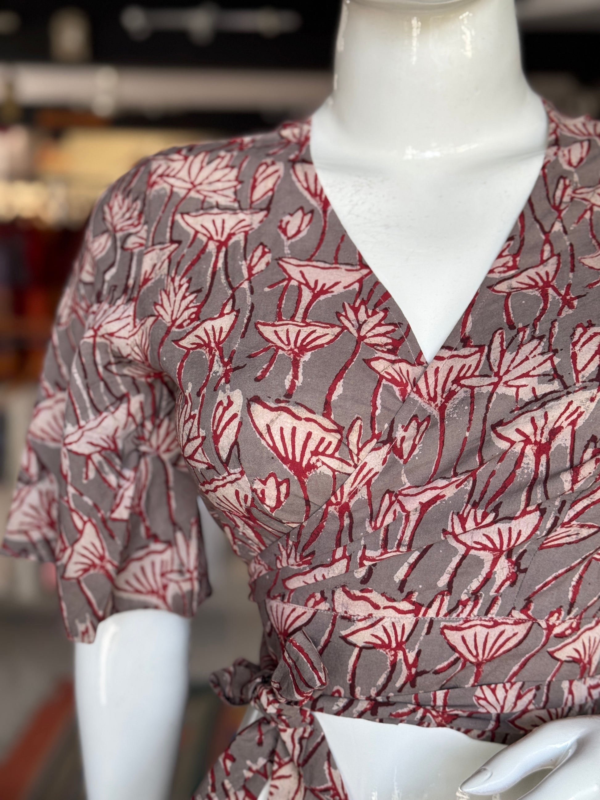 Wrap style free size cotton crop top blouse in natural dyed, hand block printed cotton
