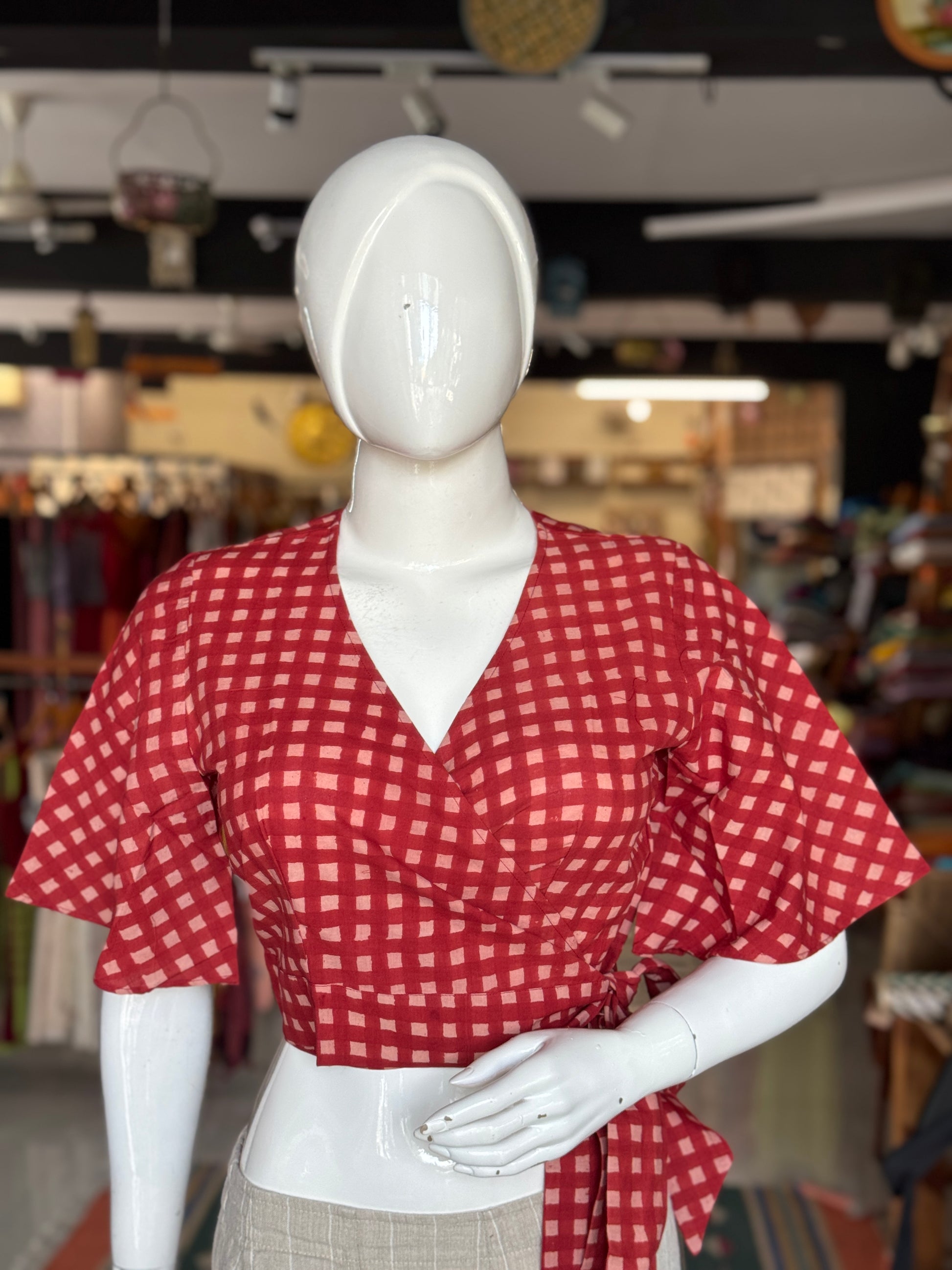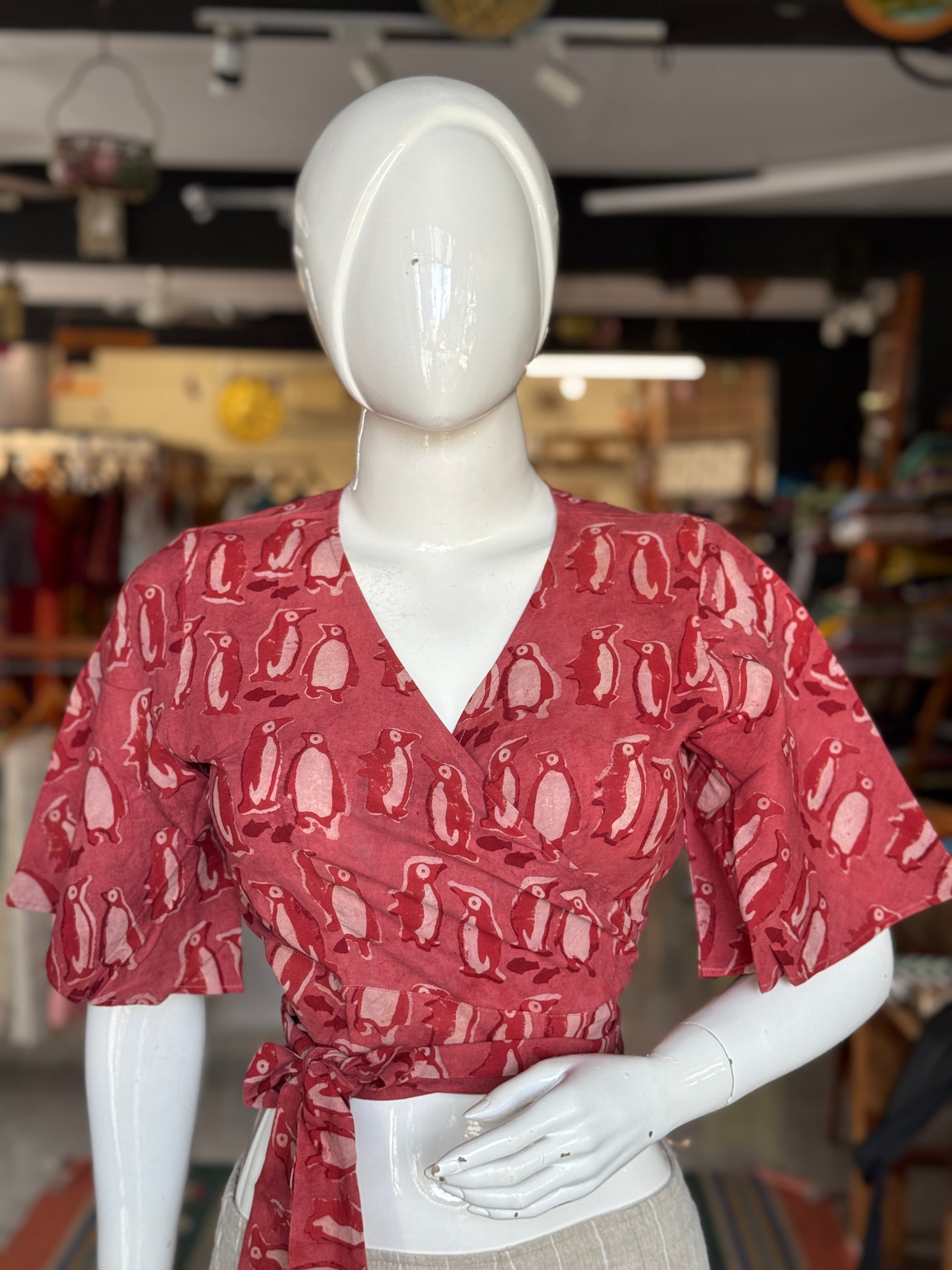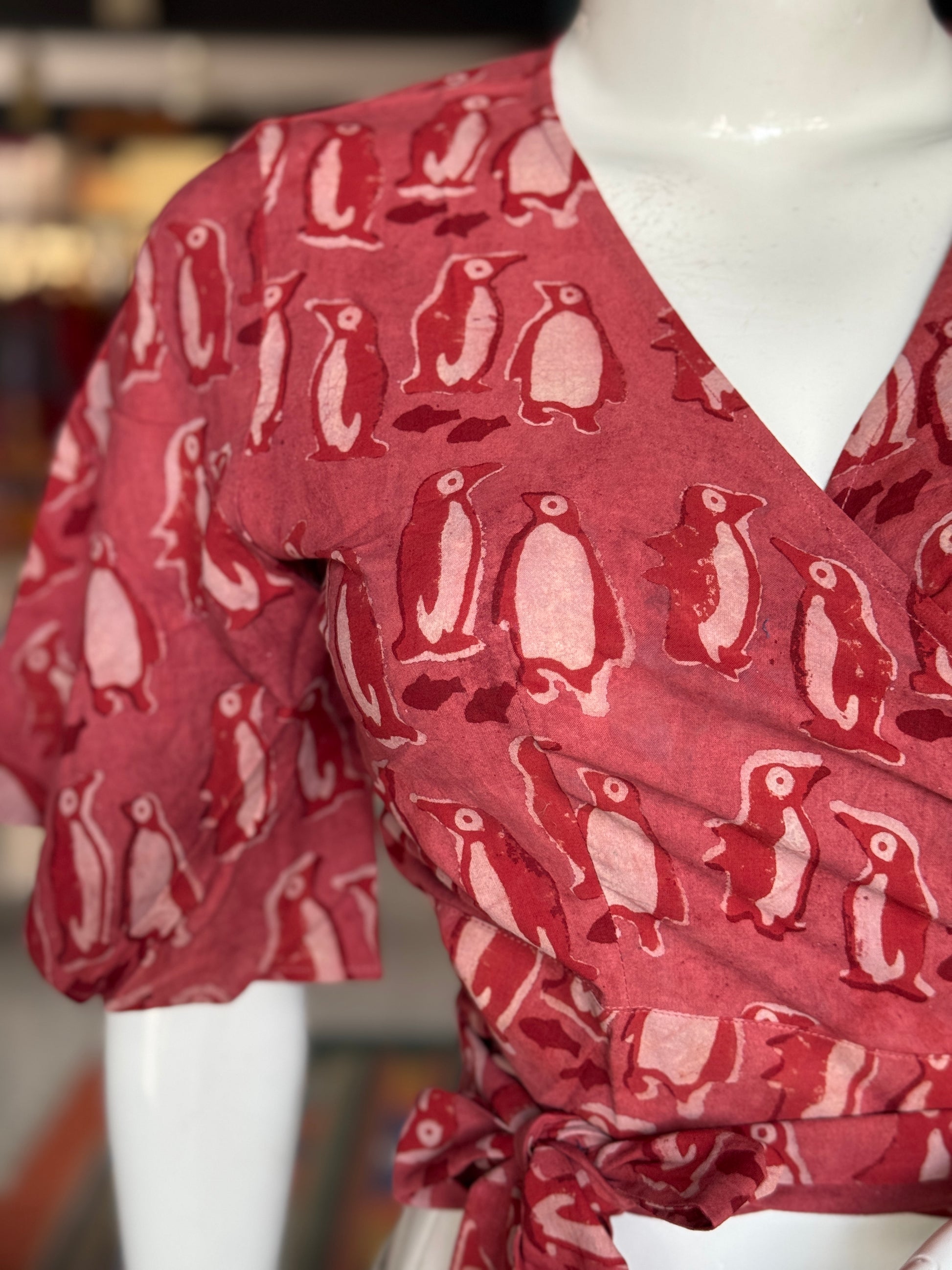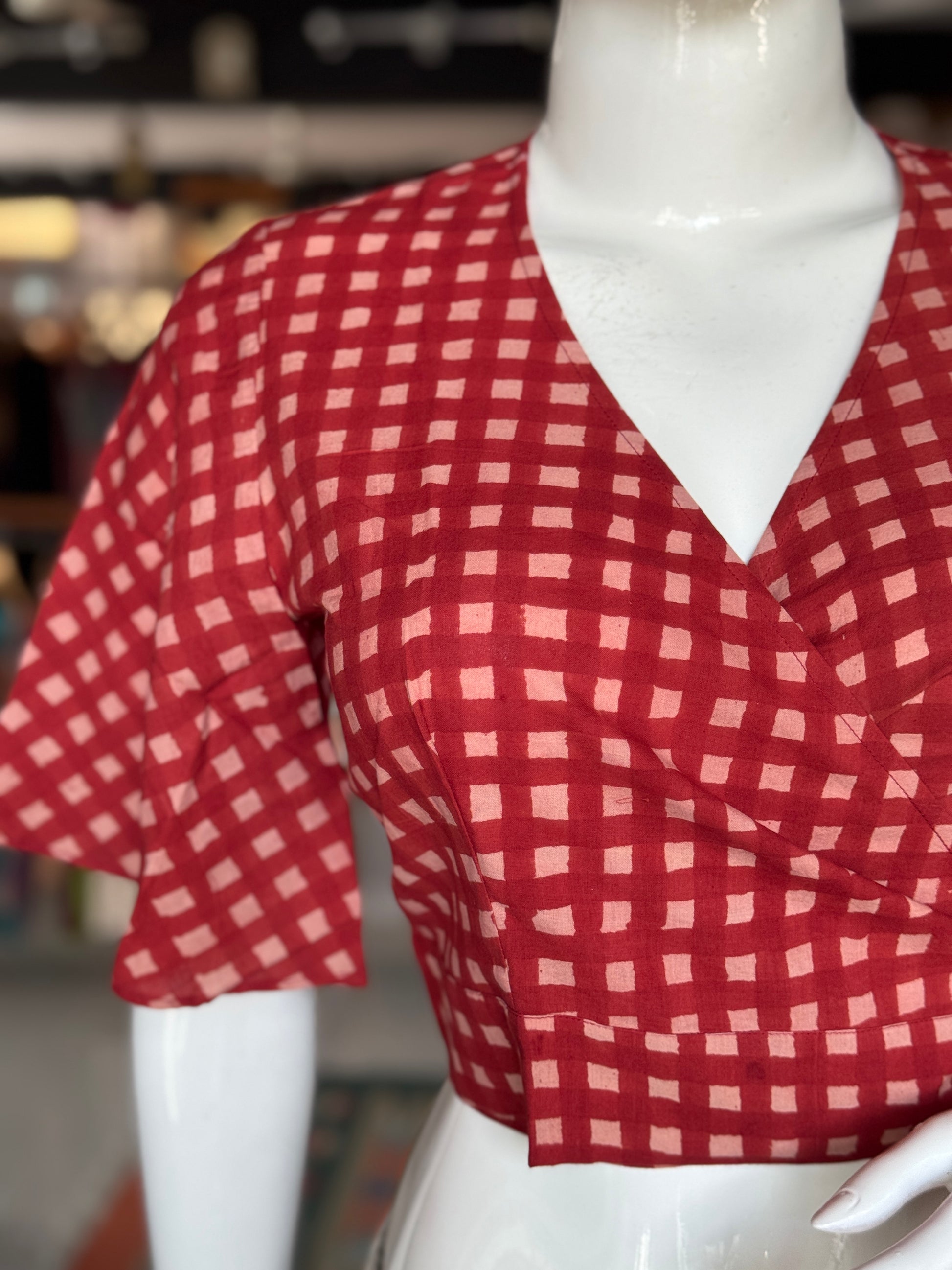Wrap style free size cotton crop top blouse in natural dyed, hand block printed cotton