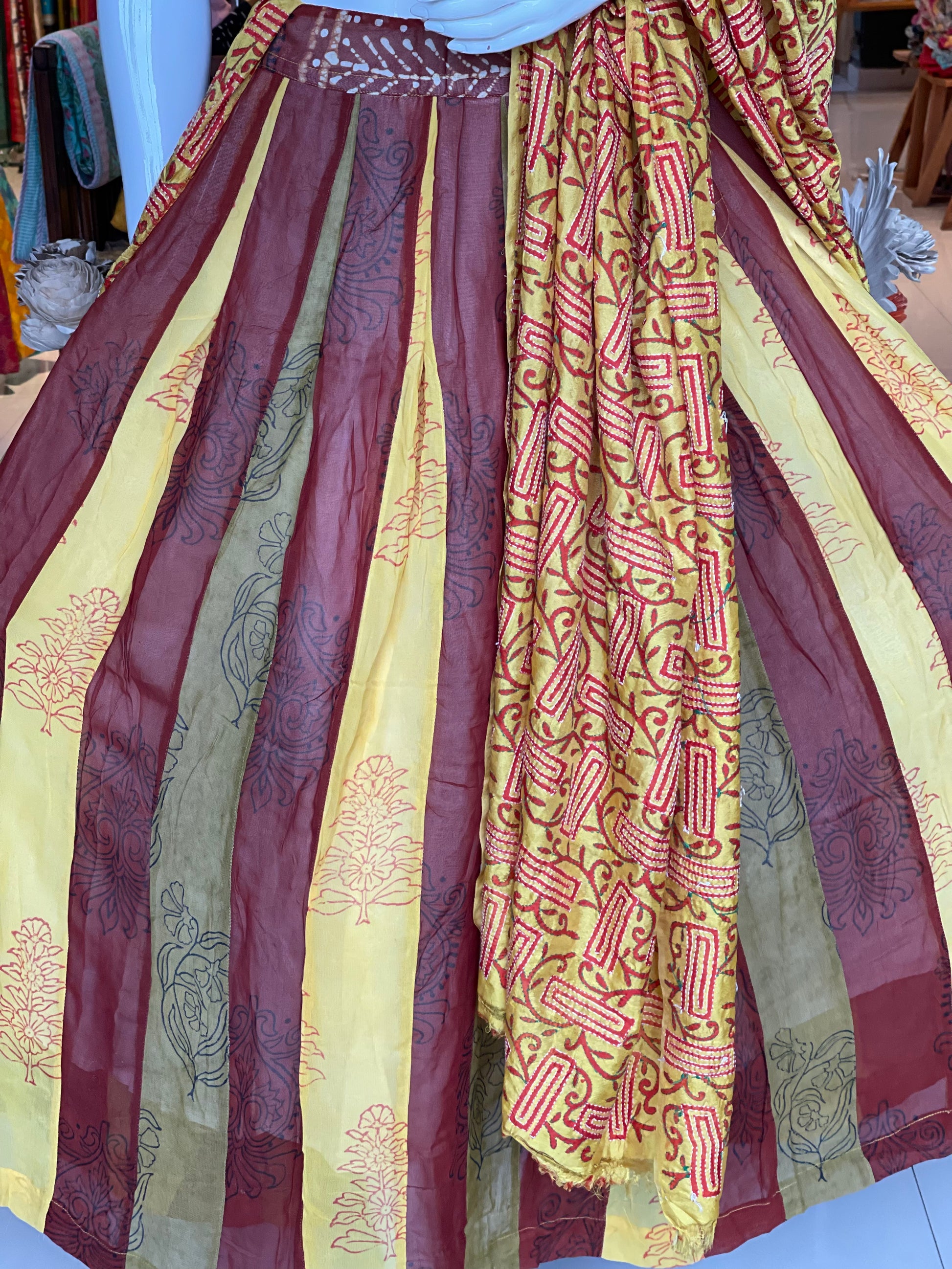 Yellow, brown and green kalis georgette free sized flared skirt