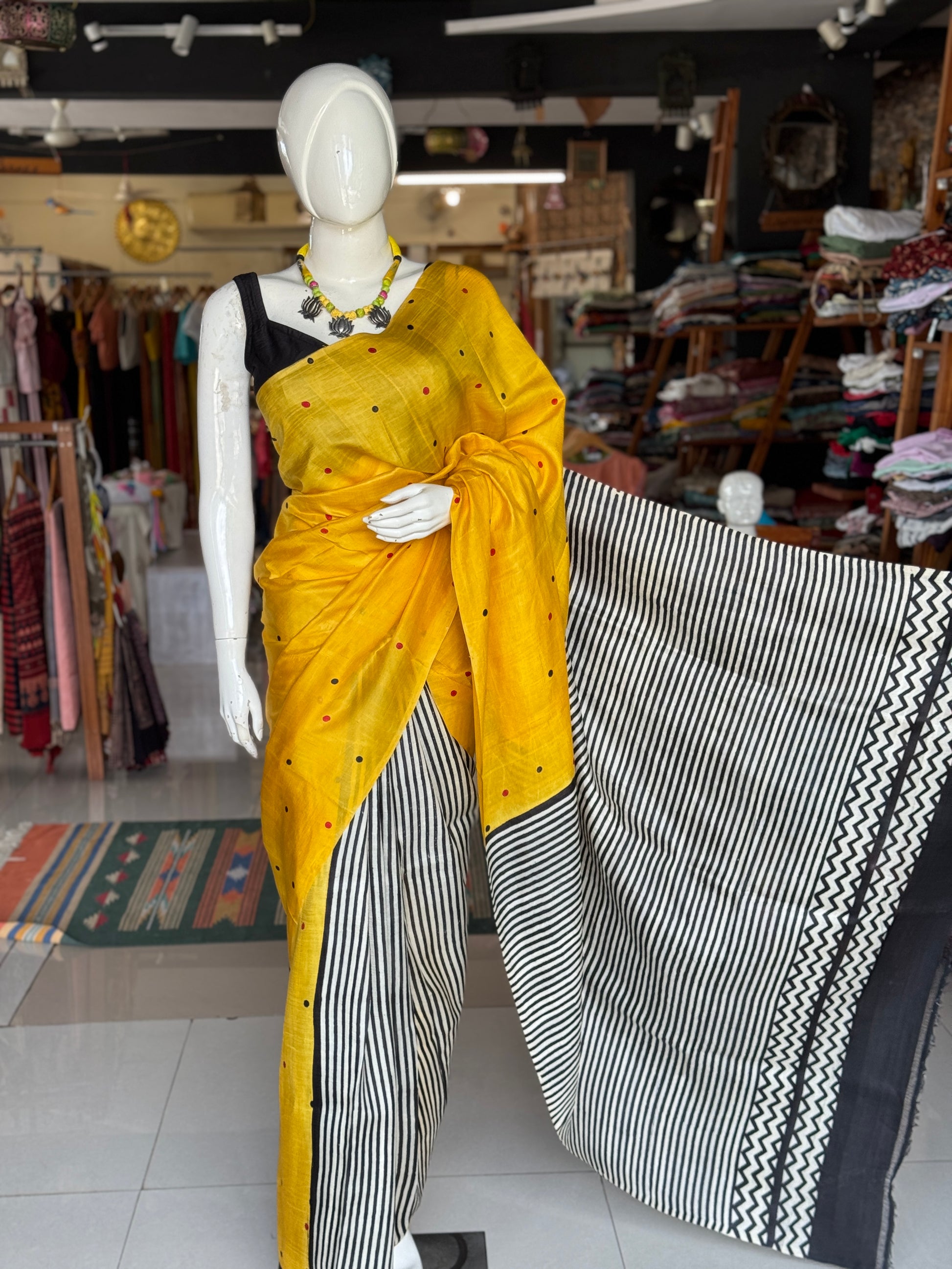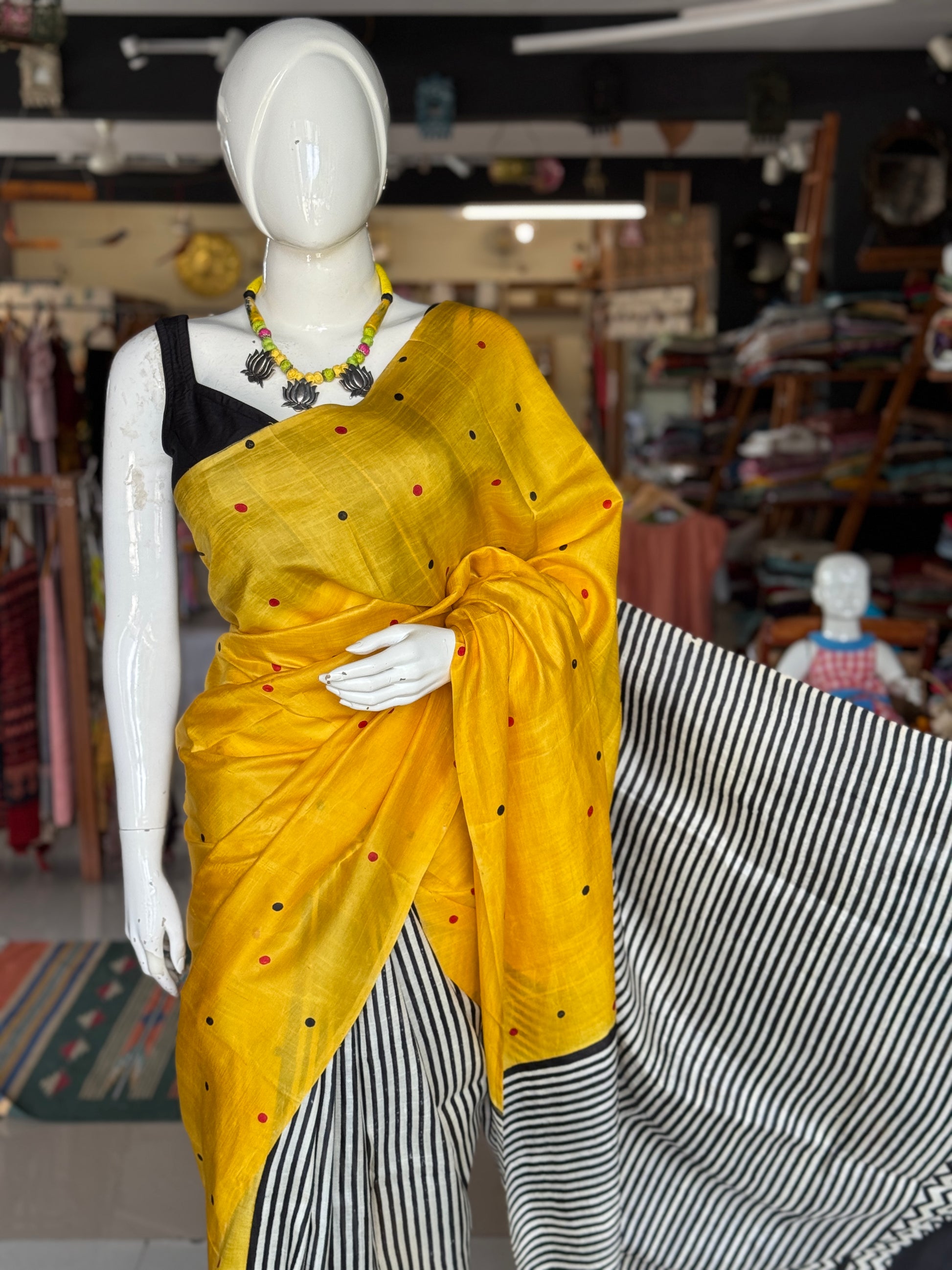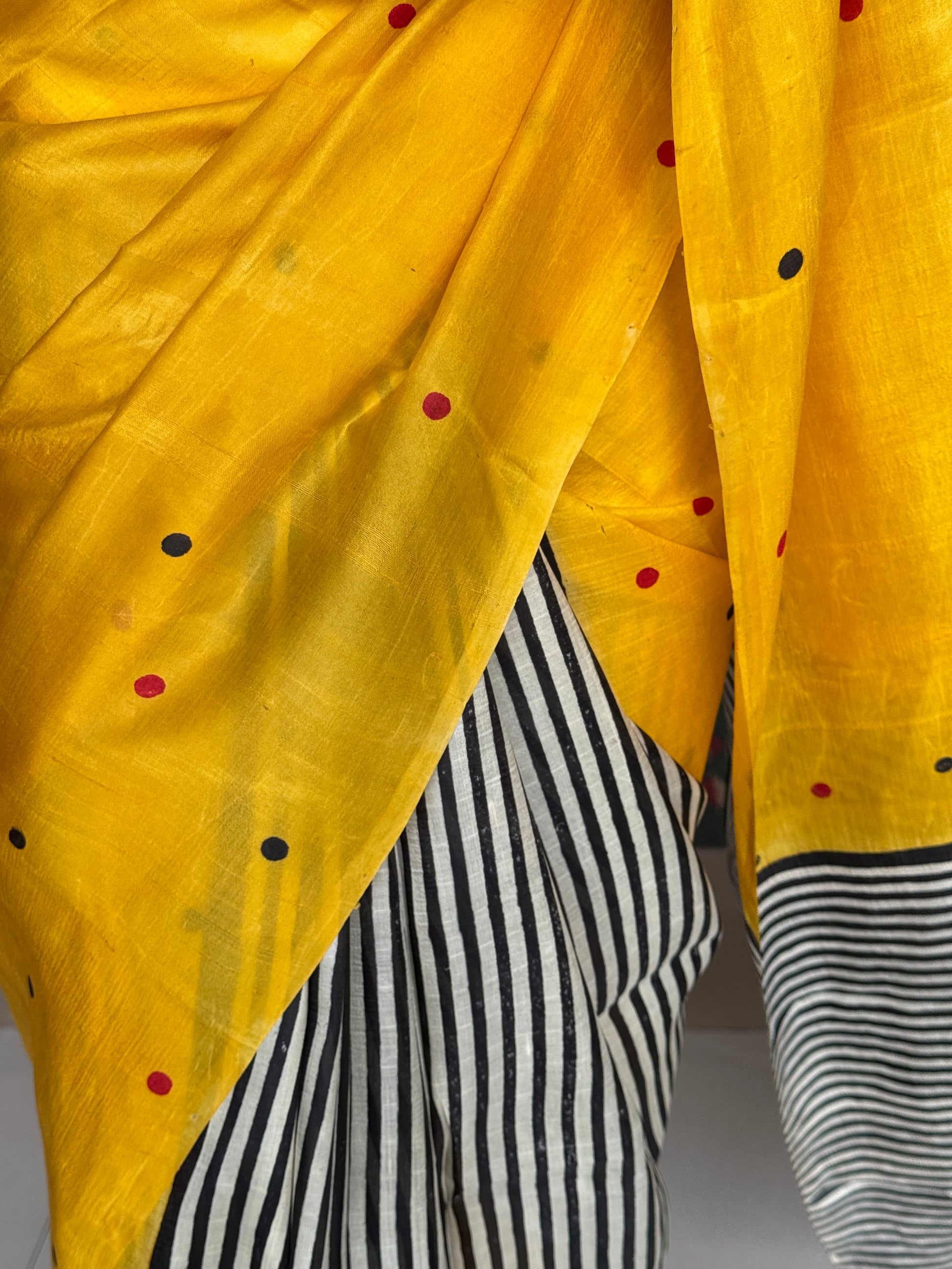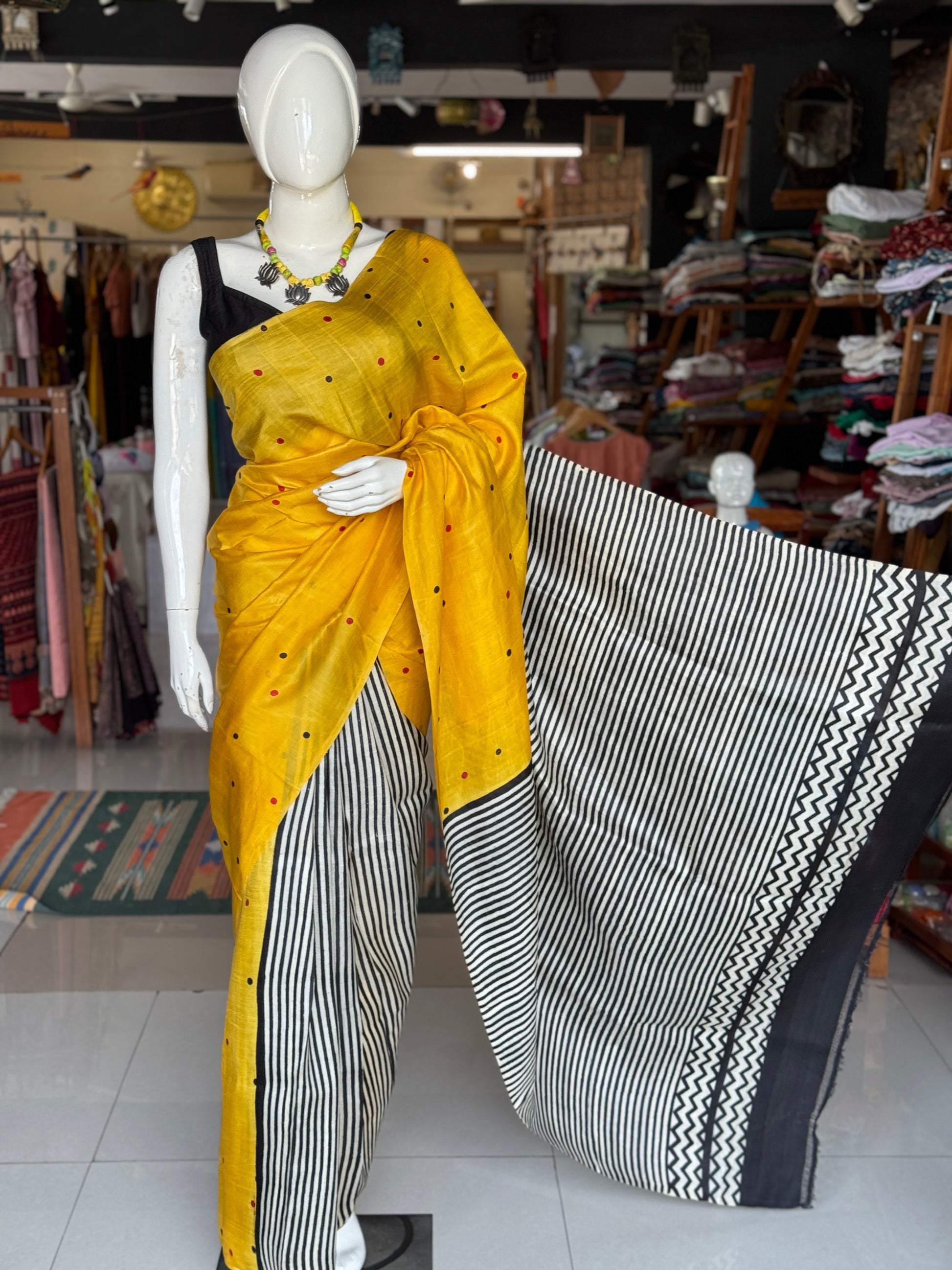 Yellow dots, black n white stripes hand crafted pure tussar silk saree - patli Pallu style