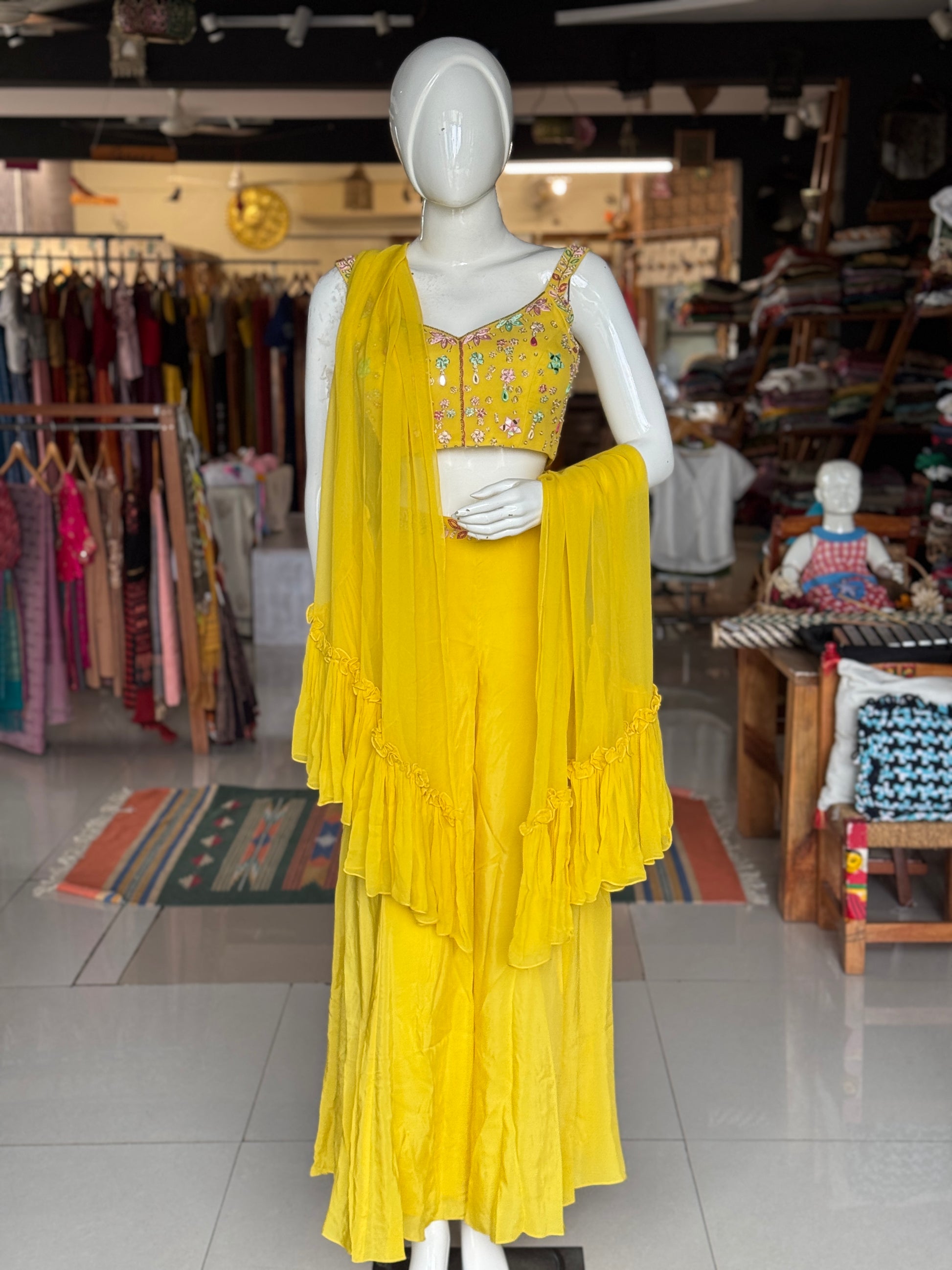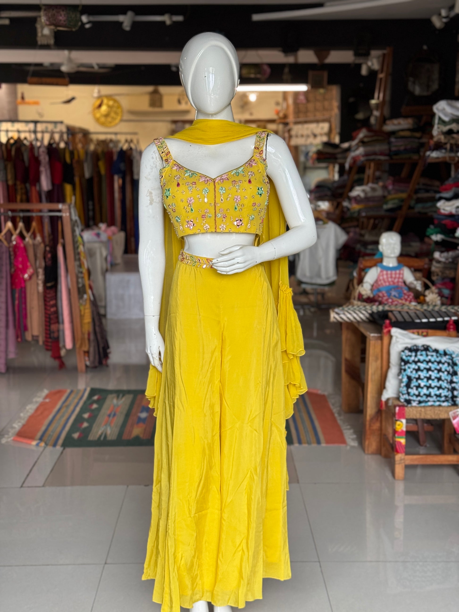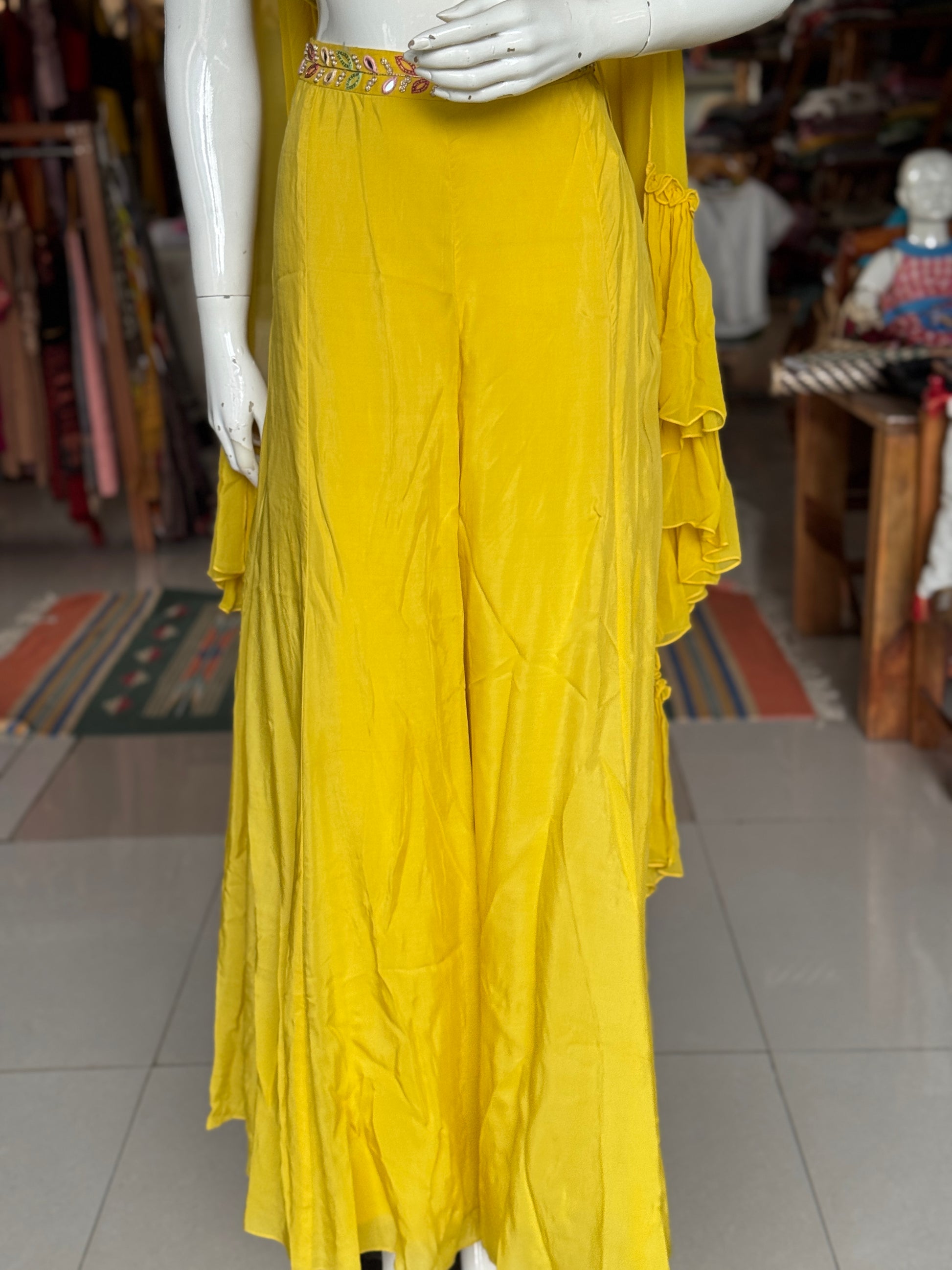 Yellow hand embroidered georgette blouse top, satin plazo and georgette ruffles dupatta - 3 piece set