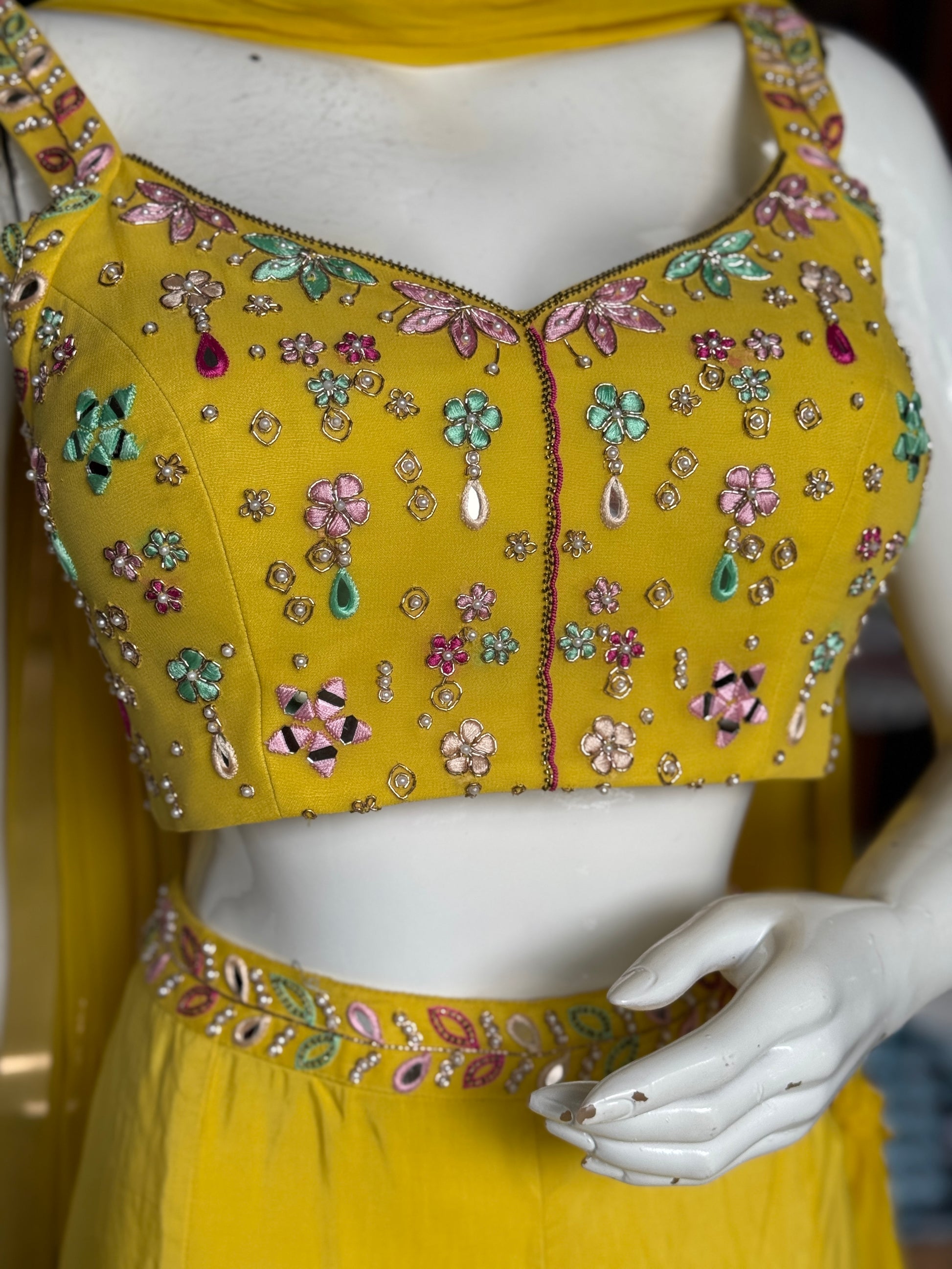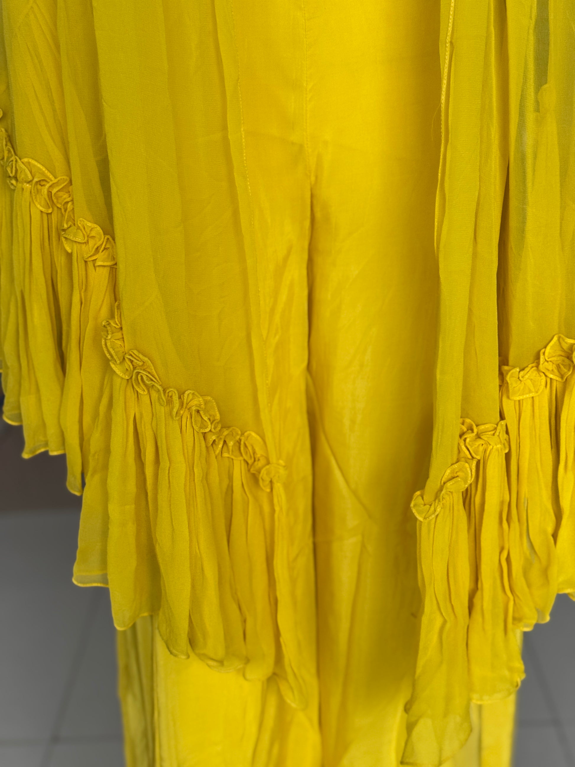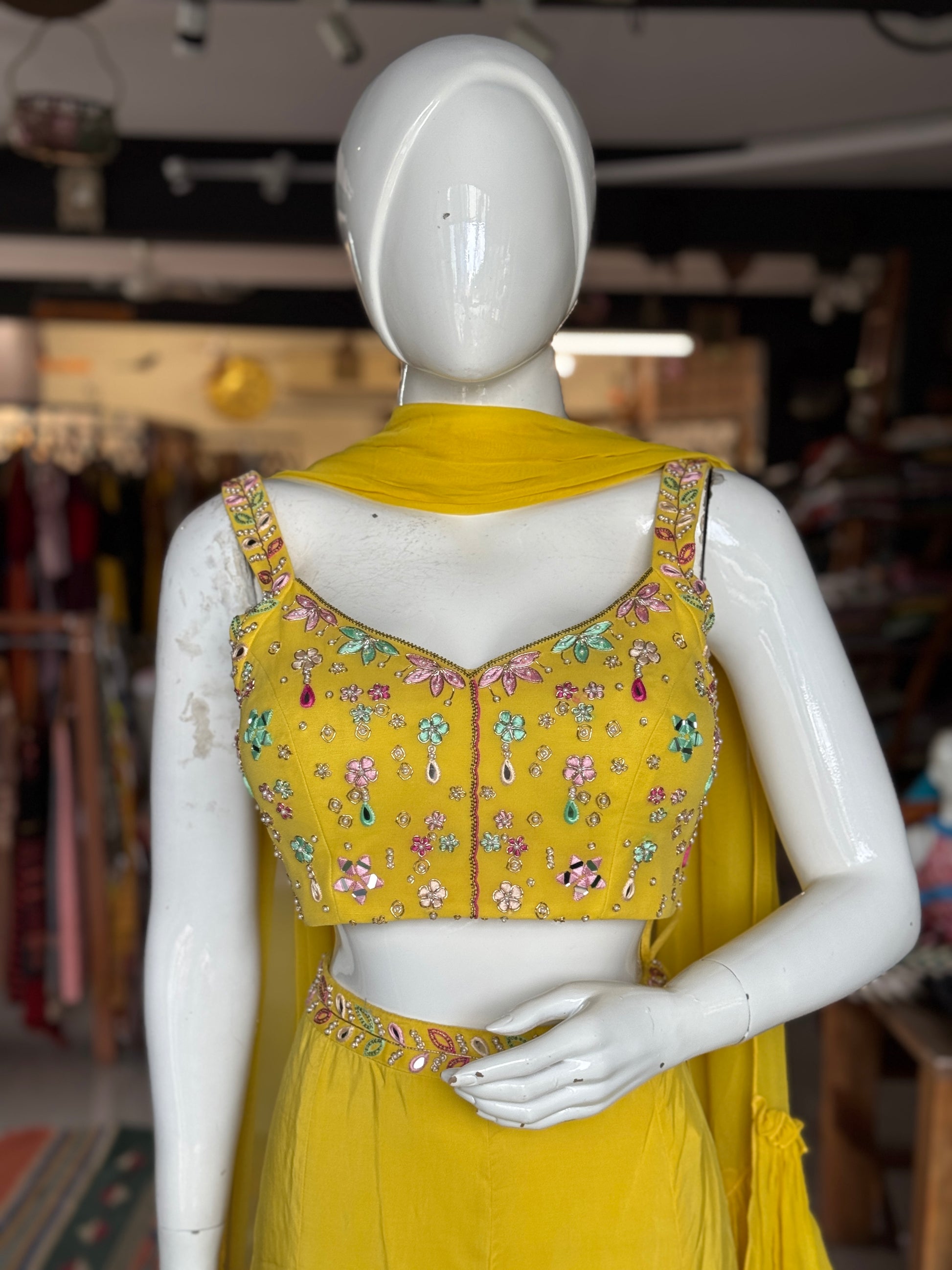 Yellow hand embroidered georgette blouse top, satin plazo and georgette ruffles dupatta - 3 piece set