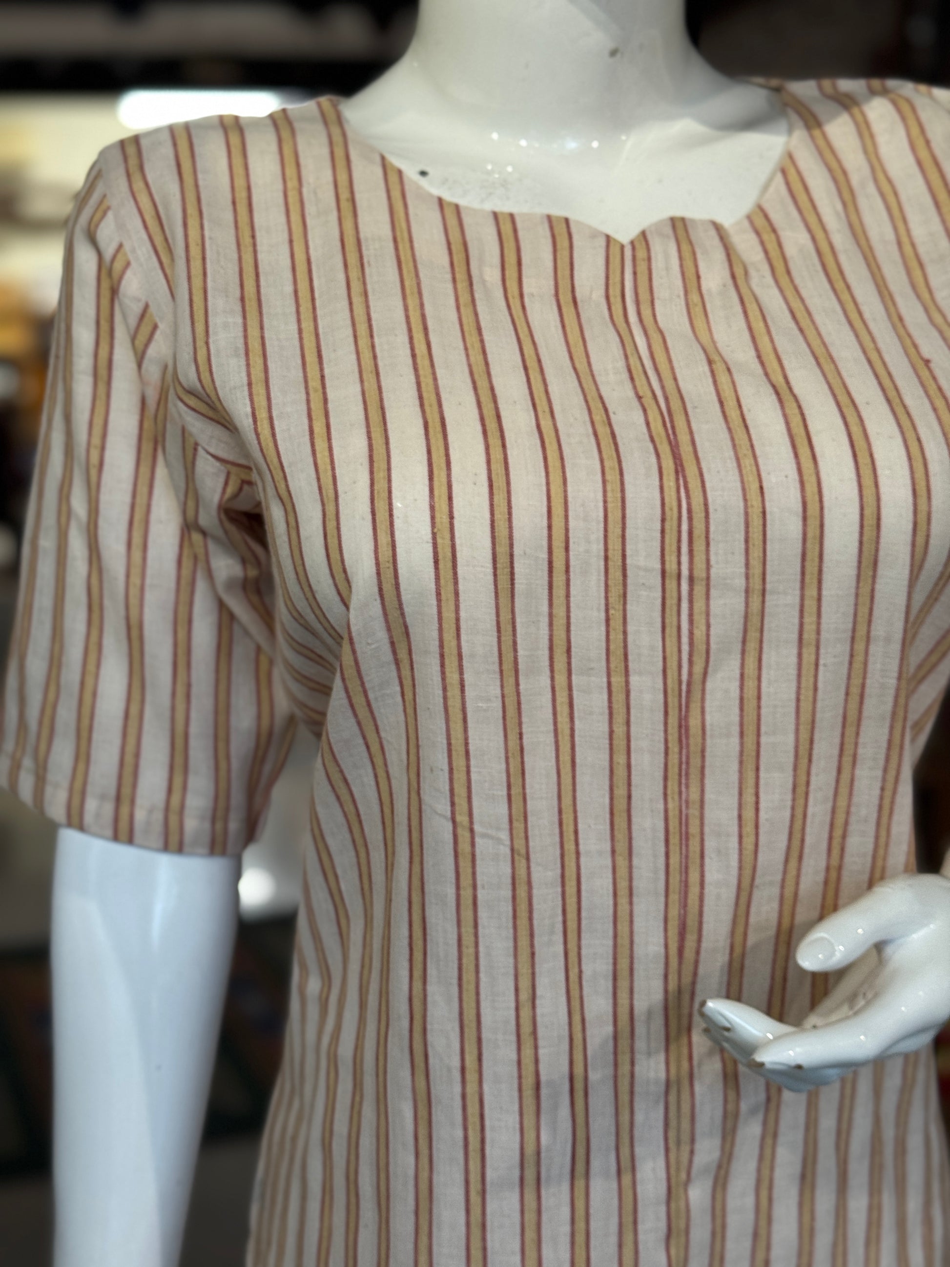 Yellow off white stripes straight kurti - hand spun, handwoven, natural dyed cotton straight kurti