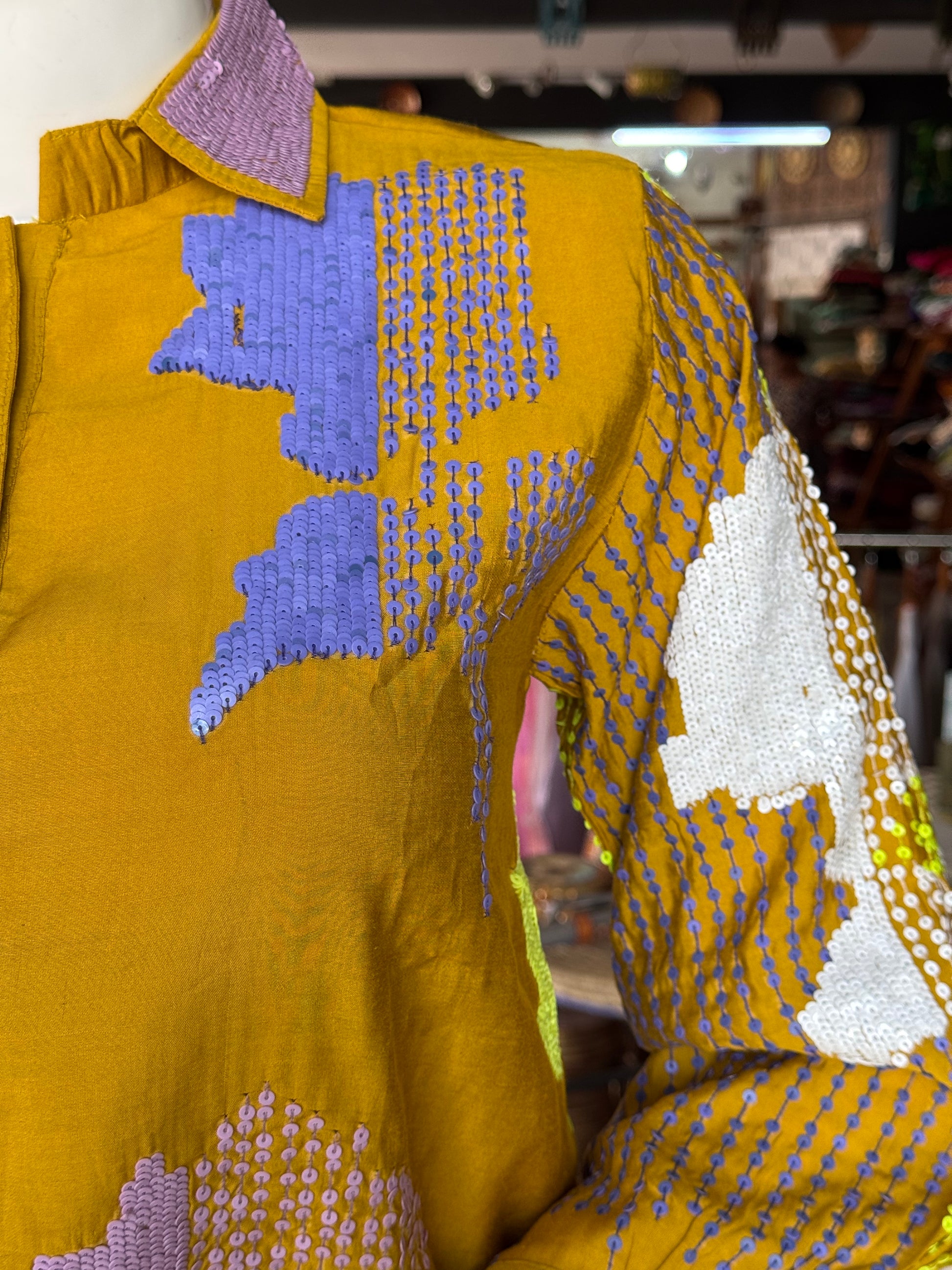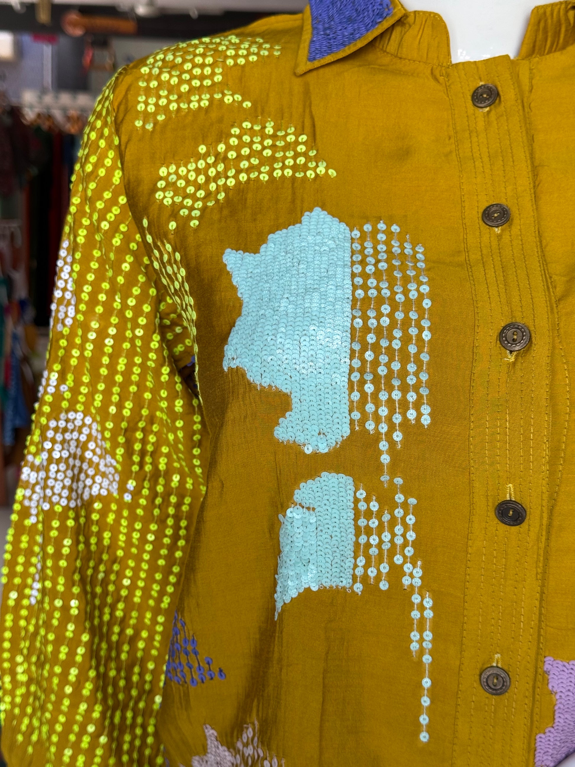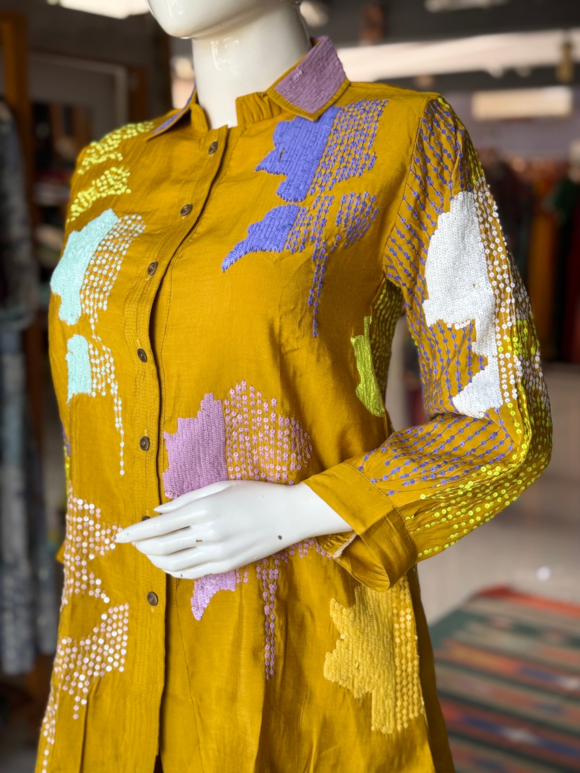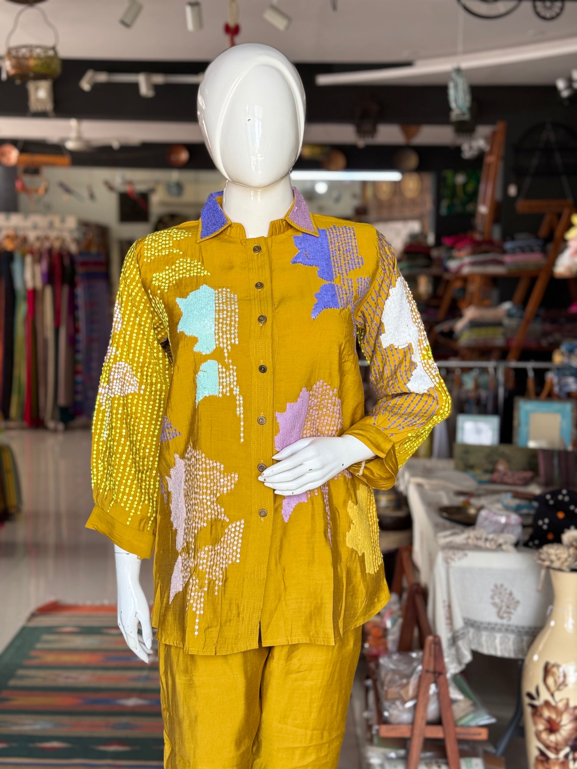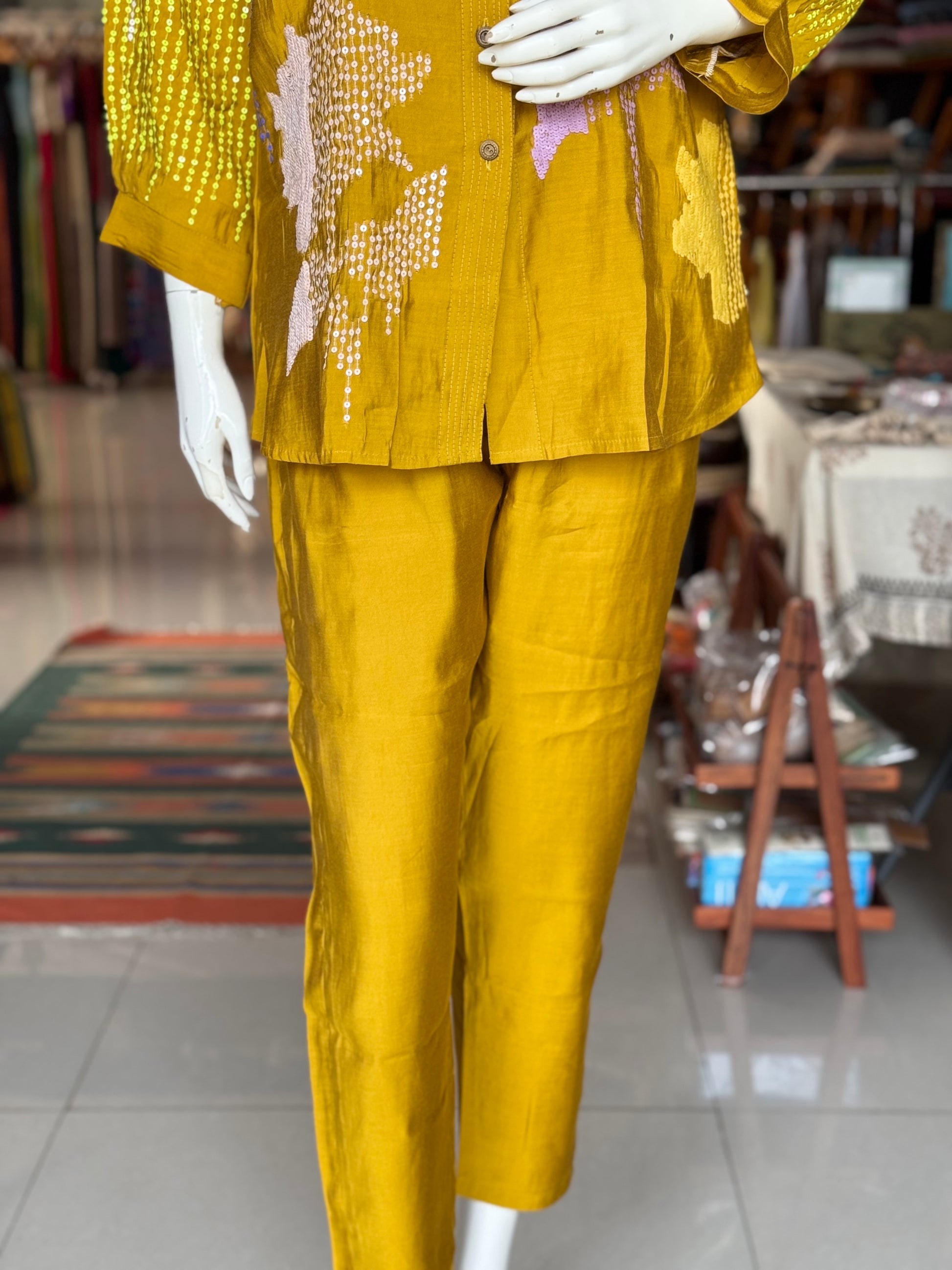 Yellow silk cotton embroidered collared top and pants party wear coord set