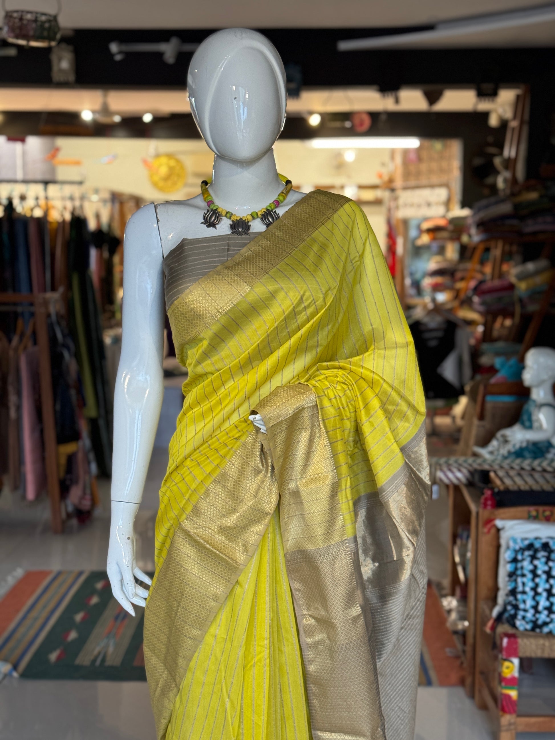 Yellow silk cotton Maheshwari handloom saree with zari pallu and vertical stripes all over