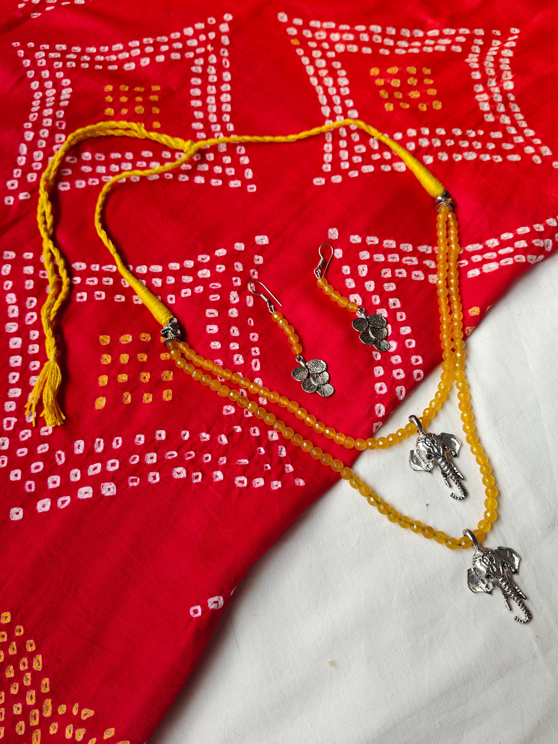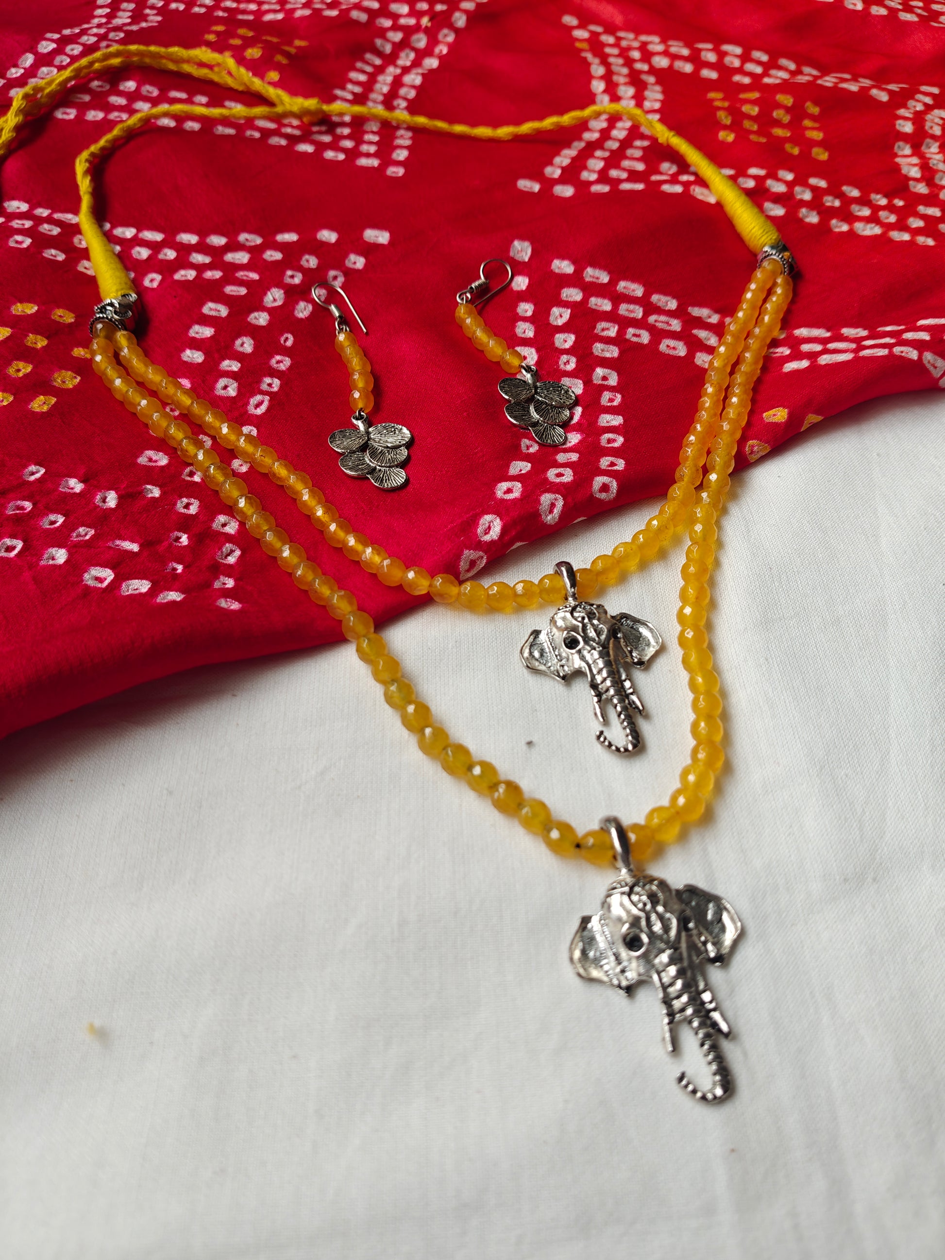 Yellow two layered neckpiece with elephant face pendants and earrings set