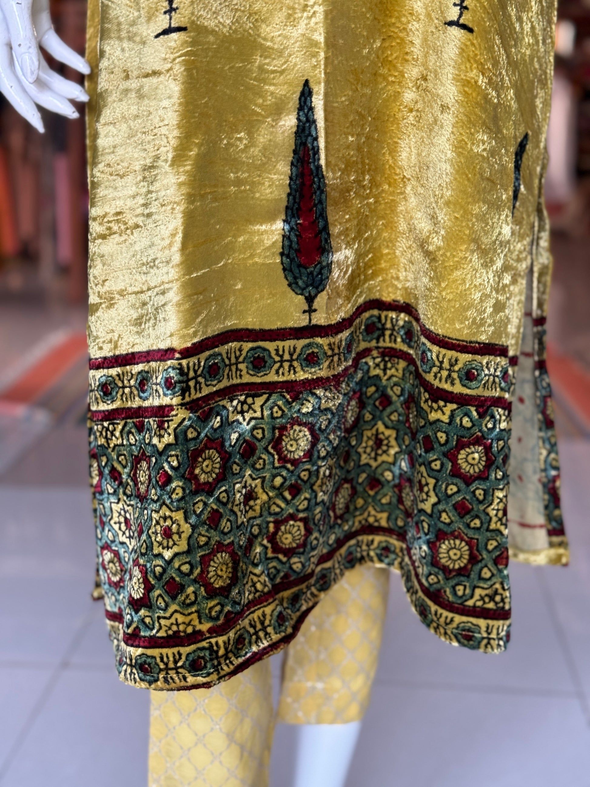 Yellow velvet straight kurti with Ajrakh hand block prints and long sleeves
