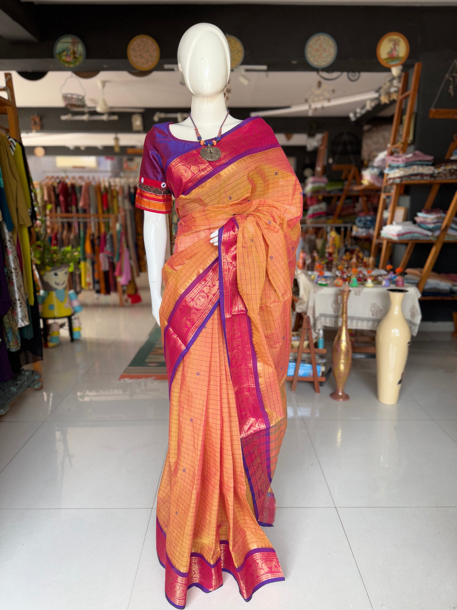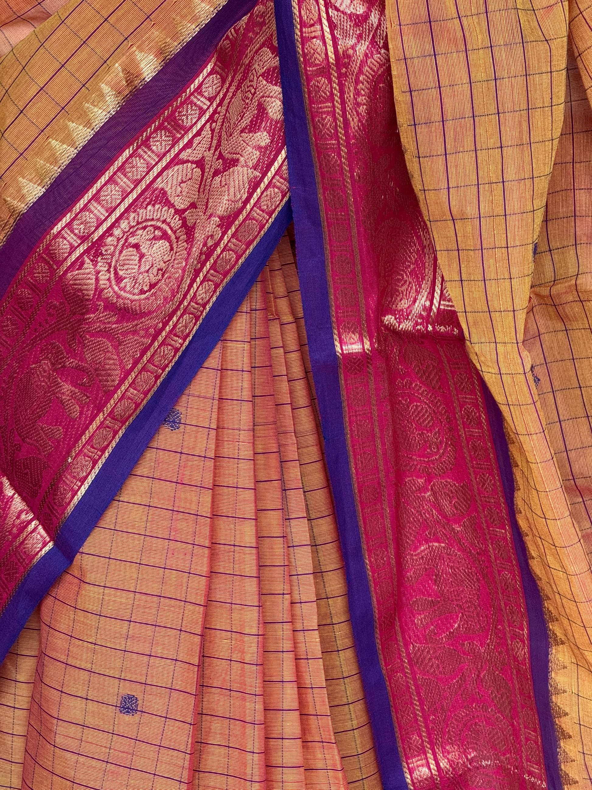 Yellow x pink cotton checkered Venkatagiri power loom saree with purple border
